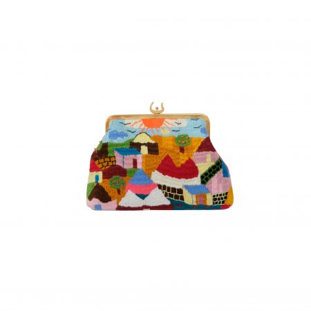 $250This clutch is a stunning showcase of artisanal craftsmanship. Its beige fabric serves as a neutral backdrop, allowing the intricate hand-beaded village scene to shine. The design features a charming array of colorful houses: a blue house with a bold red roof, a turquoise one paired with a matching red…