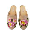 These babouches are a beautiful testament to artisanal craftsmanship. They are crafted from a beige woven fabric that provides a neutral and earthy base. Adorning the upper part of the shoes are hand-beaded floral designs, meticulously arranged to add a vibrant and artistic touch. Each babouche features a prominent pink flower accented with delicate yellow and white beadwork, complemented by lush green beaded leaves surrounding the blooms.