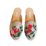 These hand-embroidered babouches beautifully showcase the rich symbolism of the pomegranate—prosperity, abundance, and deep cultural heritage. The embroidery likely highlights the intricate curves and clustered seeds of the fruit, adding texture and depth to the design. The vibrant threads contrast against the soft fabric, making each stitch a testament to artisanal craftsmanship. The slip-on silhouette ensures comfort while maintaining an effortlessly elegant look. These would pair beautifully with garments that feature floral or vine motifs, creating a cohesive, refined aesthetic.