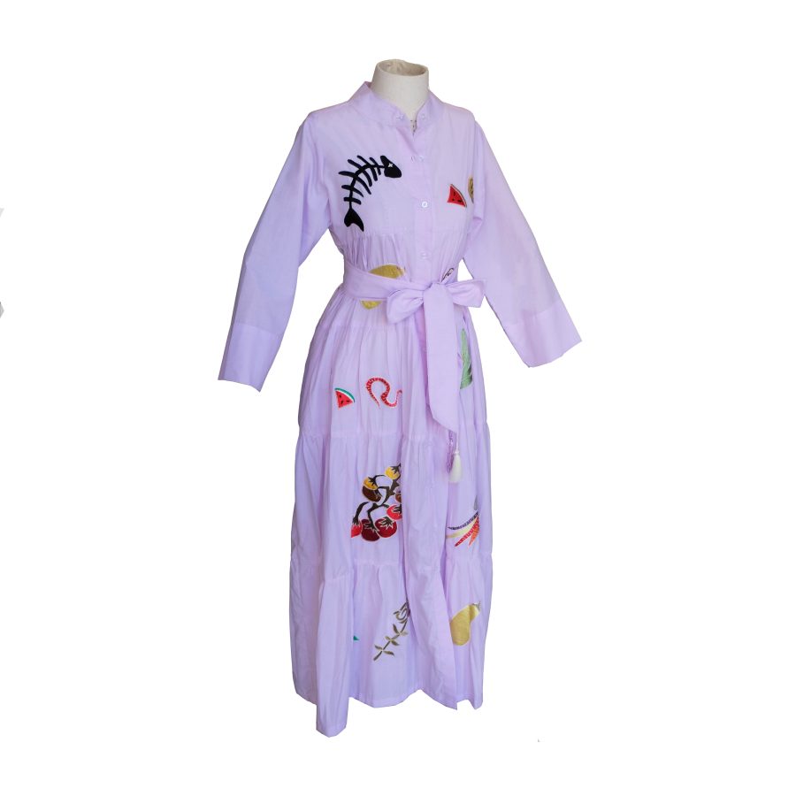 This dress is a striking fusion of artistry and organic inspiration, featuring meticulously embroidered fruits and vegetables across its fabric. The embroidery brings vibrant produce to life— tomatoes , olives, and other natural elements—stitched with rich, dynamic colors that contrast beautifully against the base material. The arrangement of these motifs gives the dress a unique sense of abundance and prosperity, making it a wearable celebration of nature’s bounty. The flowing silhouette enhances the movement of the embroidered details, while subtle embellishments add an extra touch of refinement. This piece is not only a testament to skilled craftsmanship but also a meaningful expression of culture and symbolism.