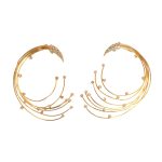 This gold-plated earring evokes the elegance of celestial forms with its sweeping crescent silhouette. Radiating from its arc are fine, tapering strands that mimic sunrays or comet trails in mid-motion, giving the piece a graceful sense of movement. Tiny, star-like accents are delicately placed along the strands, adding glints of light that dance with every turn of the head. At the top, a cluster of shimmering stones gathers where the earring meets the lobe, providing a luxurious anchor. The overall design feels both ethereal and contemporary—perfect for someone drawn to modern pieces with poetic, cosmic undertones.