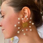 Earrings gold plated with sun design and white pearls.
