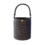 Hand Bag in brown “straw” fabrics and cylinder shape . The bag is fully lined in our signature cotton fabrics with closing strap and it comes with a protection bag.