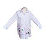 This charming shirt features intricate village embroidery that captures the essence of a picturesque countryside scene. The base color of the shirt is a clean white, providing a perfect canvas for the detailed embroidery. Colorful houses in blue and red, vibrant green trees, and a radiant yellow sun are beautifully depicted along the bottom half of the shirt. The long sleeves add to its elegant look, while the additional red stitching along the collar and cuffs offers a delightful finishing touch. This whimsical piece adds a touch of artistry and warmth to any wardrobe, making it a standout garment for any occasion.